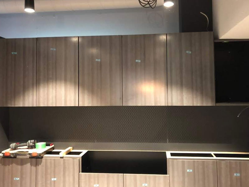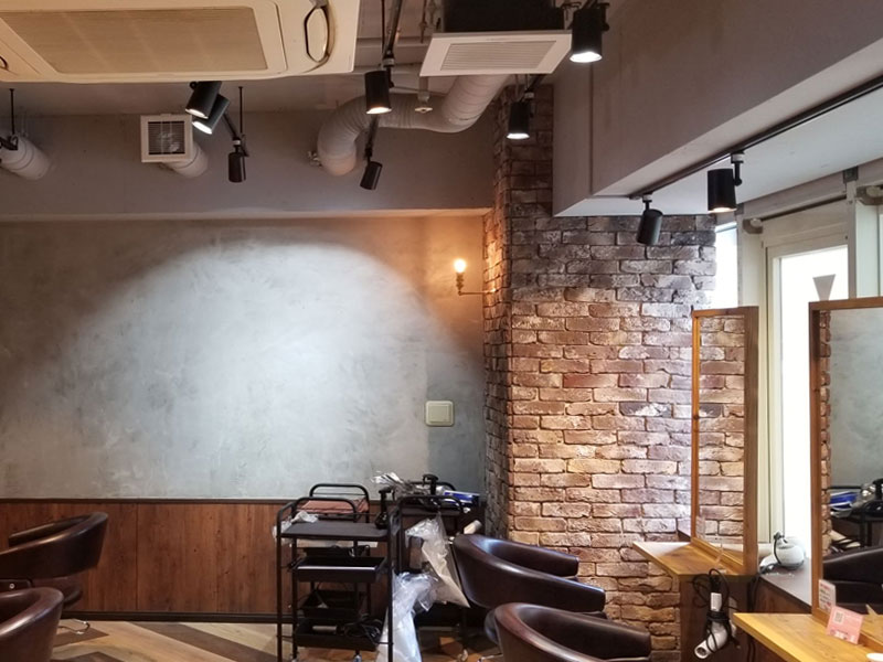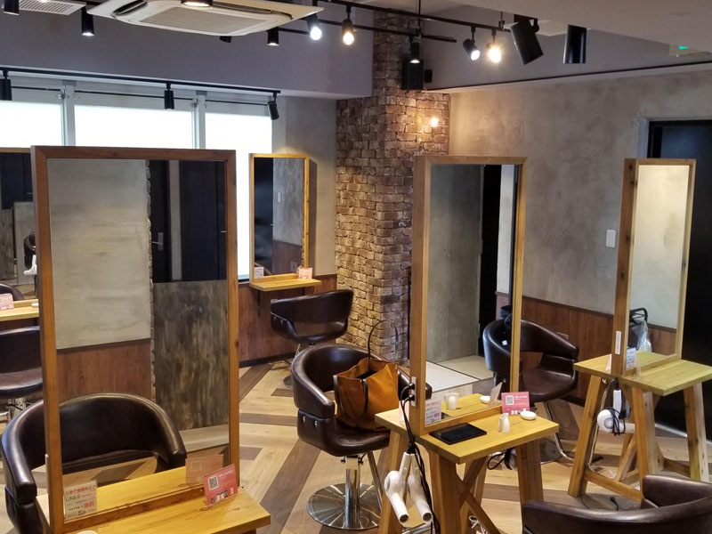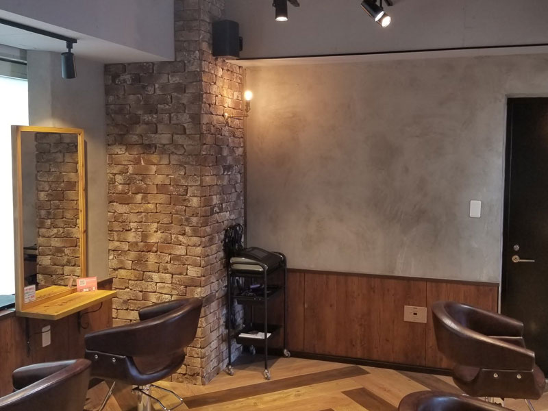 店内の中心に配置されているシャンプルームも壁にエキスパンドメタルのカッティングシートを使用したガラス窓を作り、サイドの腰壁もルーバーの色味にこだわり、閉鎖感をなくしました。