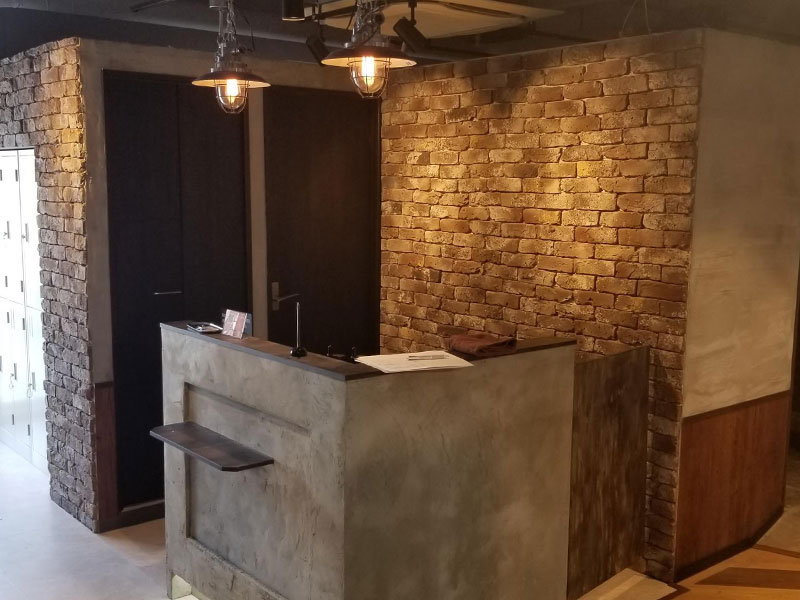 男性らしさを全面に出しつつも、正面の店名を催したメインサインや天井から下がっているグリーンで強くなりすぎないよう意識をしました。