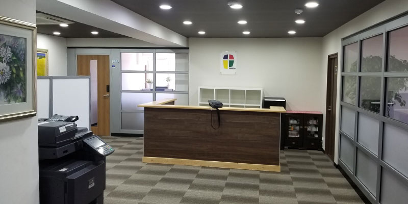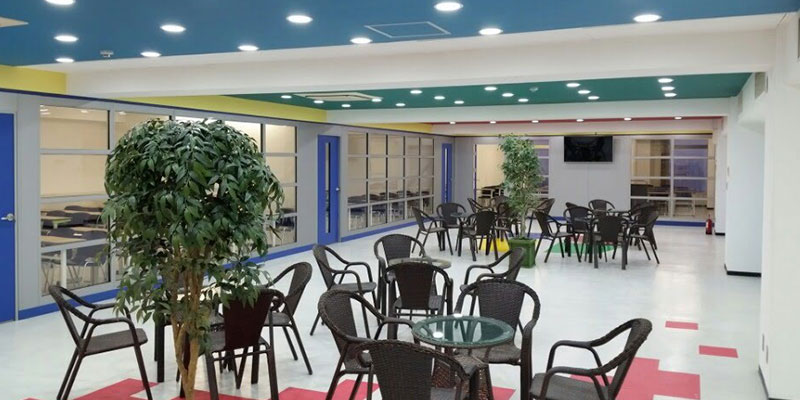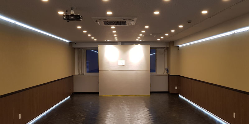 大型ホワイトボードやモニターを備えた教卓側を向いて生徒が座る集団指導向けの教室デザイン。 限られたスペースにより多くの席数を確保したい場合に適したコンパクトなスモール研修用デスクは、温もりを感じさせる木調のフローリングにもしっくりと馴染む明るいナチュラル天板を選択。シャープなデザインの黒のループ脚チェアを合わせることで引き締まり、メリハリのある空間となっています。<